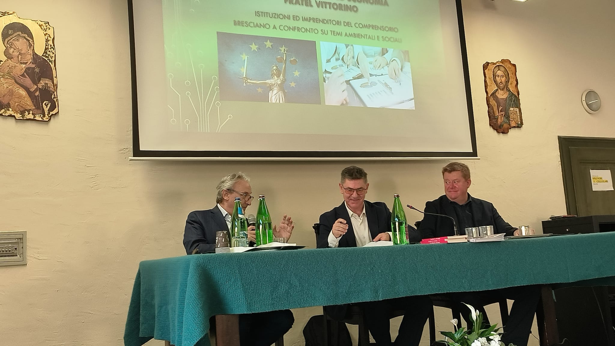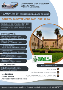 L’Associazione Etica Economia Fratel Vittorino, ha organizzato in data 20-09-2025 nell’Abbazia di Maguzzano (Lonato- Bs), un incontro dal titolo “LAUDATO SI’ : CUSTODIRE LA CASA COMUNE“. Sono state coinvolte Istituzioni ed Imprenditori del comprensorio bresciano a confronto sui temi sociali che stanno diventando sempre più importanti ed urgenti. L’appuntamento ha rappresentato un’occasione preziosa per promuovere la condivisione di idee e buone pratiche volte alla tutela dell’ambiente e al rafforzamento del senso di responsabilità collettiva verso il pianeta. Attraverso la partecipazione attiva di diversi attori del territorio e il coordinamento del Presidente dell’Associazione , Ermes Bampa , si è voluto sottolineare quanto sia fondamentale, oggi più che mai, agire insieme per il bene comune, seguendo lo spirito e i valori proposti dall’enciclica Laudato Si’.